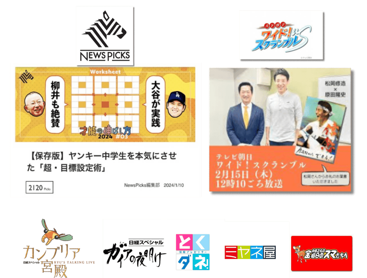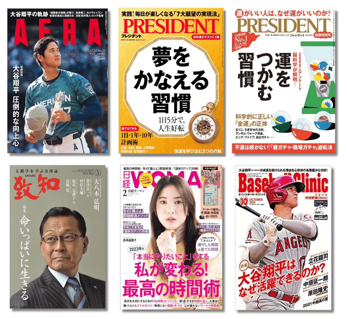 AERA、致知、PRESIDENT、日経BP、Wall Street Journal、日経WOMAN、月刊陸上競技、Baseball Clinicなど